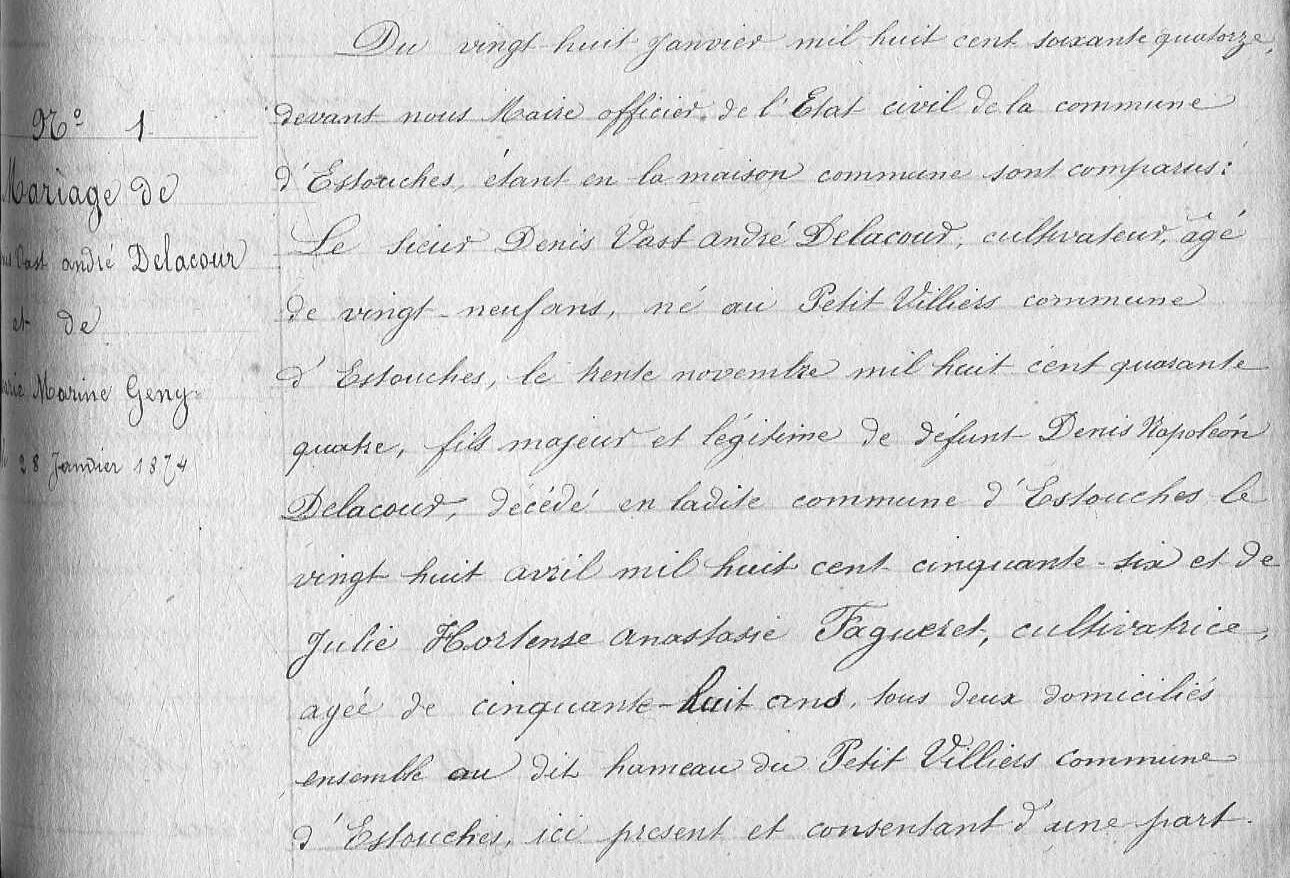 - Denis-Vaast-André Delacour, né à au Petit-Villiers, commune d'Estouches le 30 novembre 1844, était le fils de Julie-Hortense-Anastasie Fagueret (1816-1893) et du cultivateur Denis-Napoléon Delacour (1810-1856).
