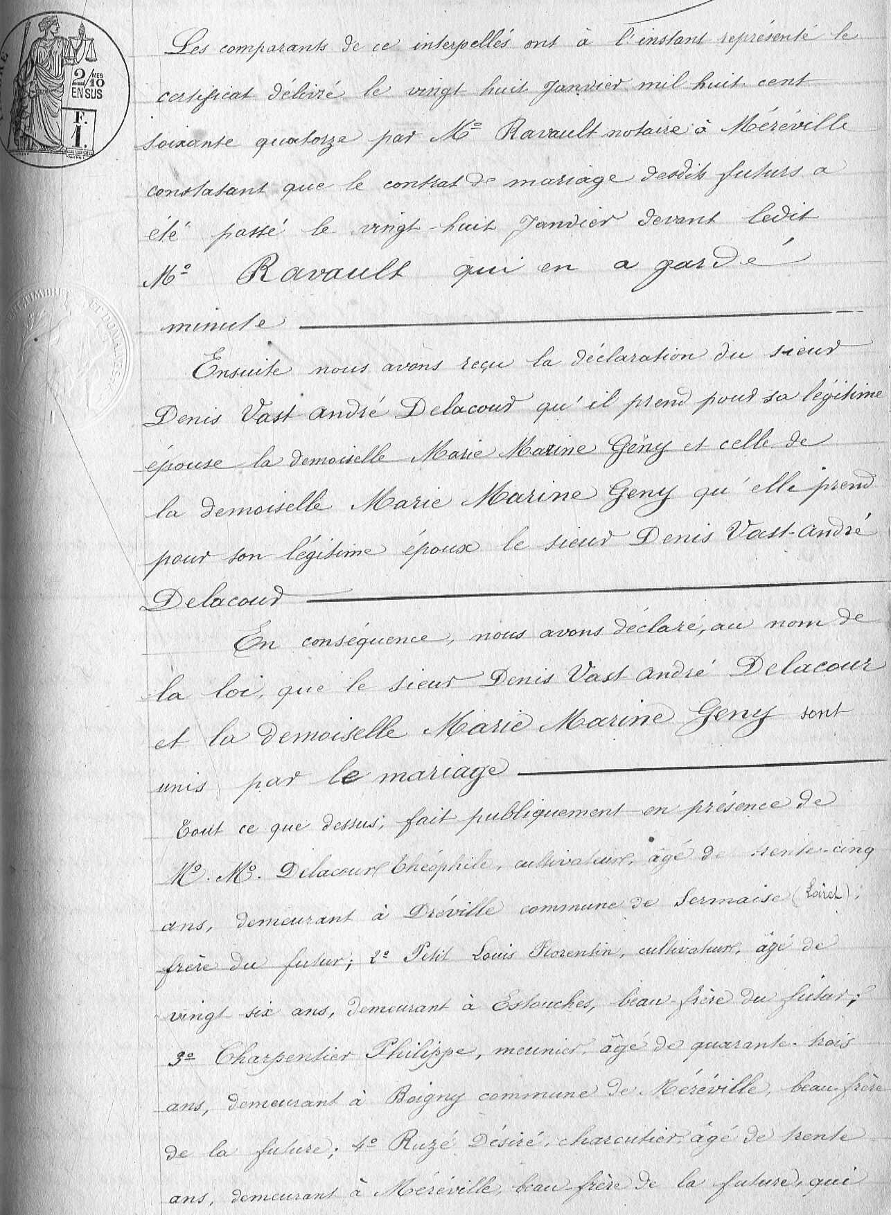 - Charles-Albert-Denis Delacour (1874-?), marié le 5 octobre 1903 à Méréville avec Sidonie-Ambroisine-Eudoxie Monceau.