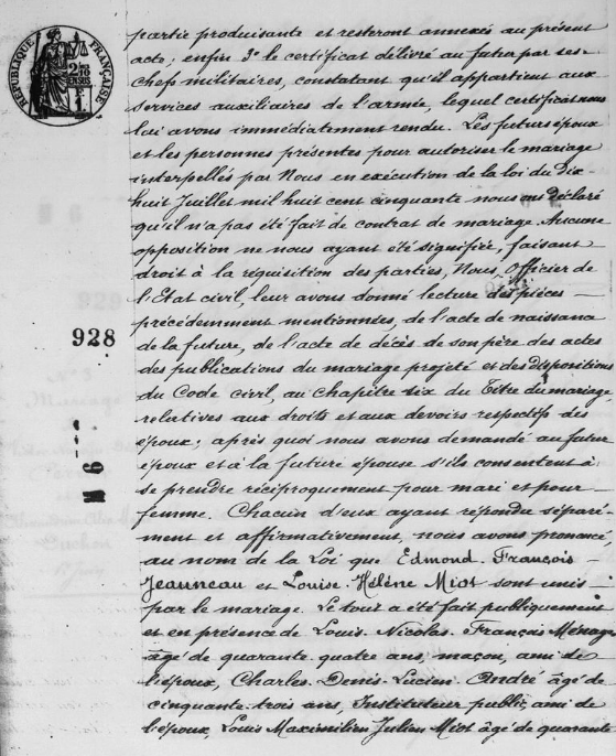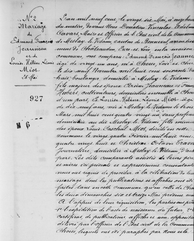 - Il se maria à Meslay-le-Vidame (Eure-et-Loir) le 26 mai 1900 avec Louise-Hélène-Léonie Miot, née le 3 mars 1881 à Meslay-le-Vidame, fille de Louis-Paschal Miot et de Christine-Octavie Travers).