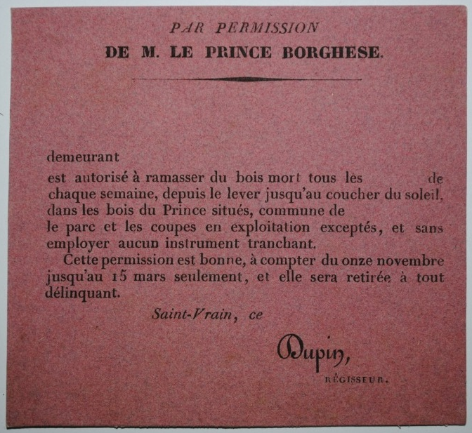 - Permission de prélever du bois mort dans les bois de Saint-Vrain (vers 1825?)