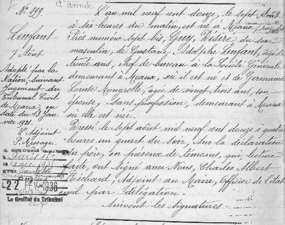 - Il fut adopté par la Nation par jugement du Tribunal civile de Meaux en date du 13 janvier 1921.