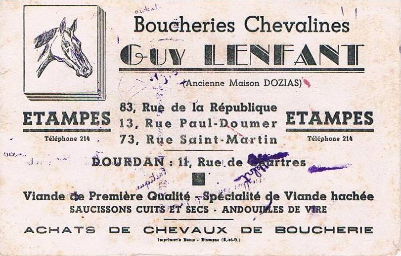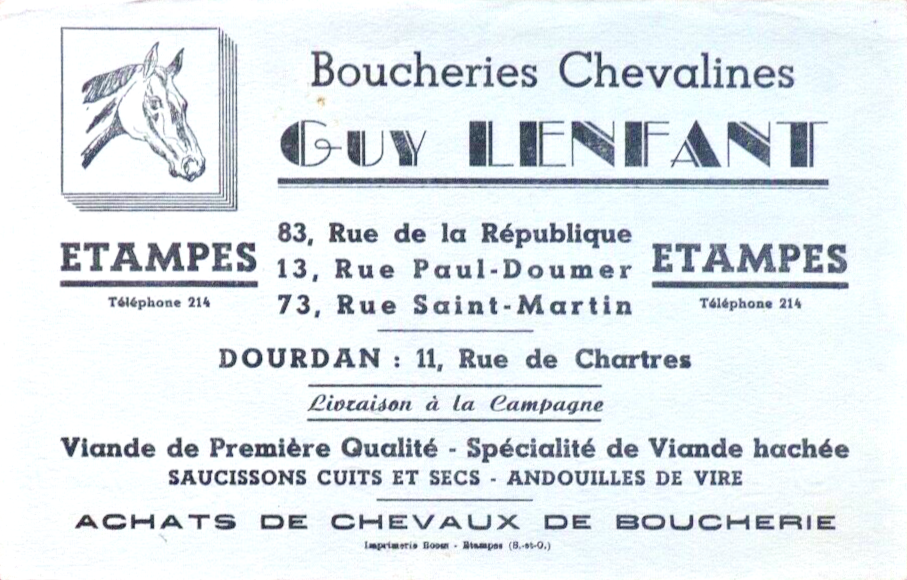 - Texte: “Boucheries chevalines Guy Lenfant (Ancienne maison Dozias) — Étampes — 83, rue de la République — 13, rue Paul-Doumer — 73, rue Saint-Martin — Étampes — Dourdan: 11, rue de Chartres — Viande de première qualité — Spécialité de viande hachée — Saucissons cuits et secs — Andouille de Vire — Achats de chevaux de boucherie — Imprimerie Bodin - Étampes (S.-et-O.).”