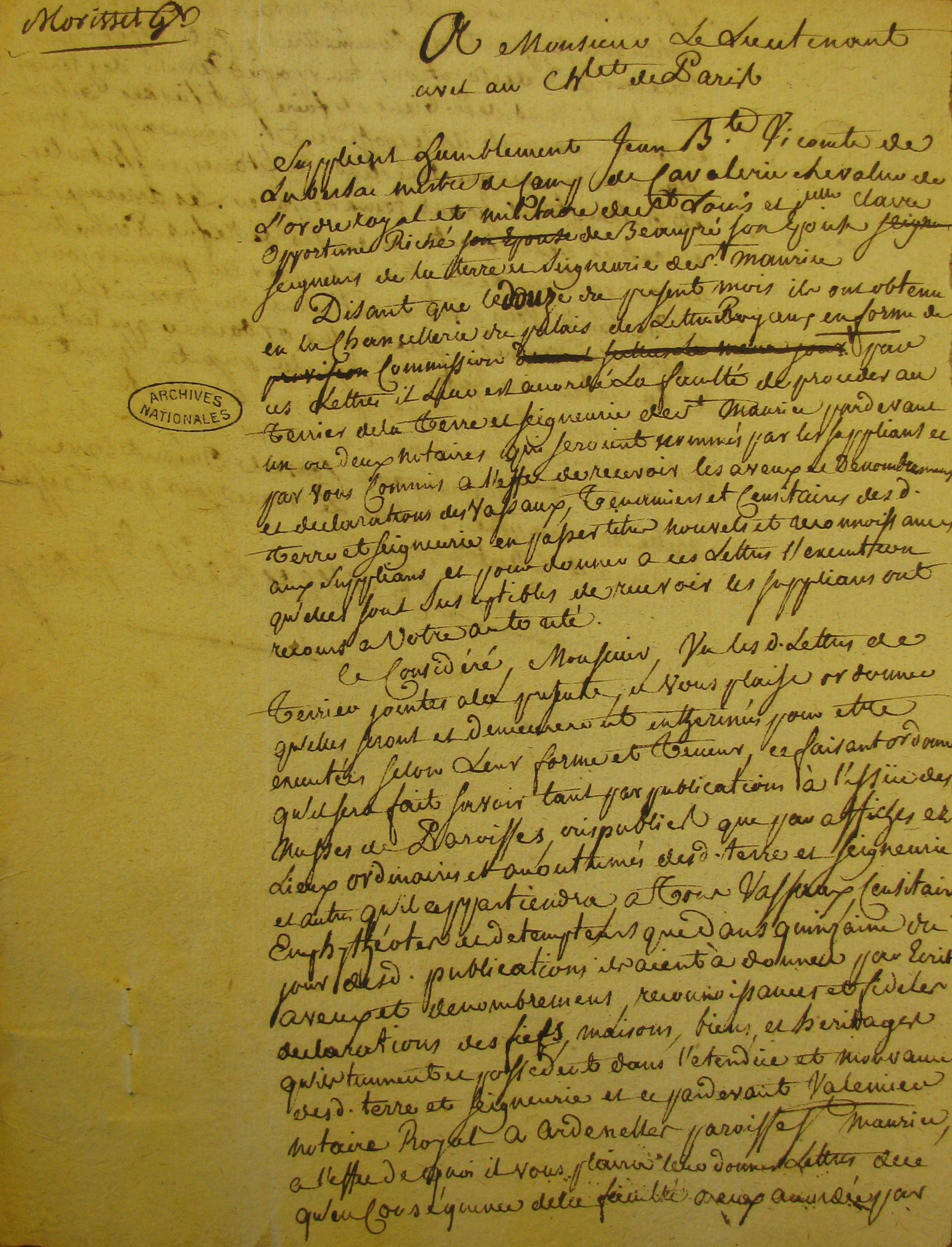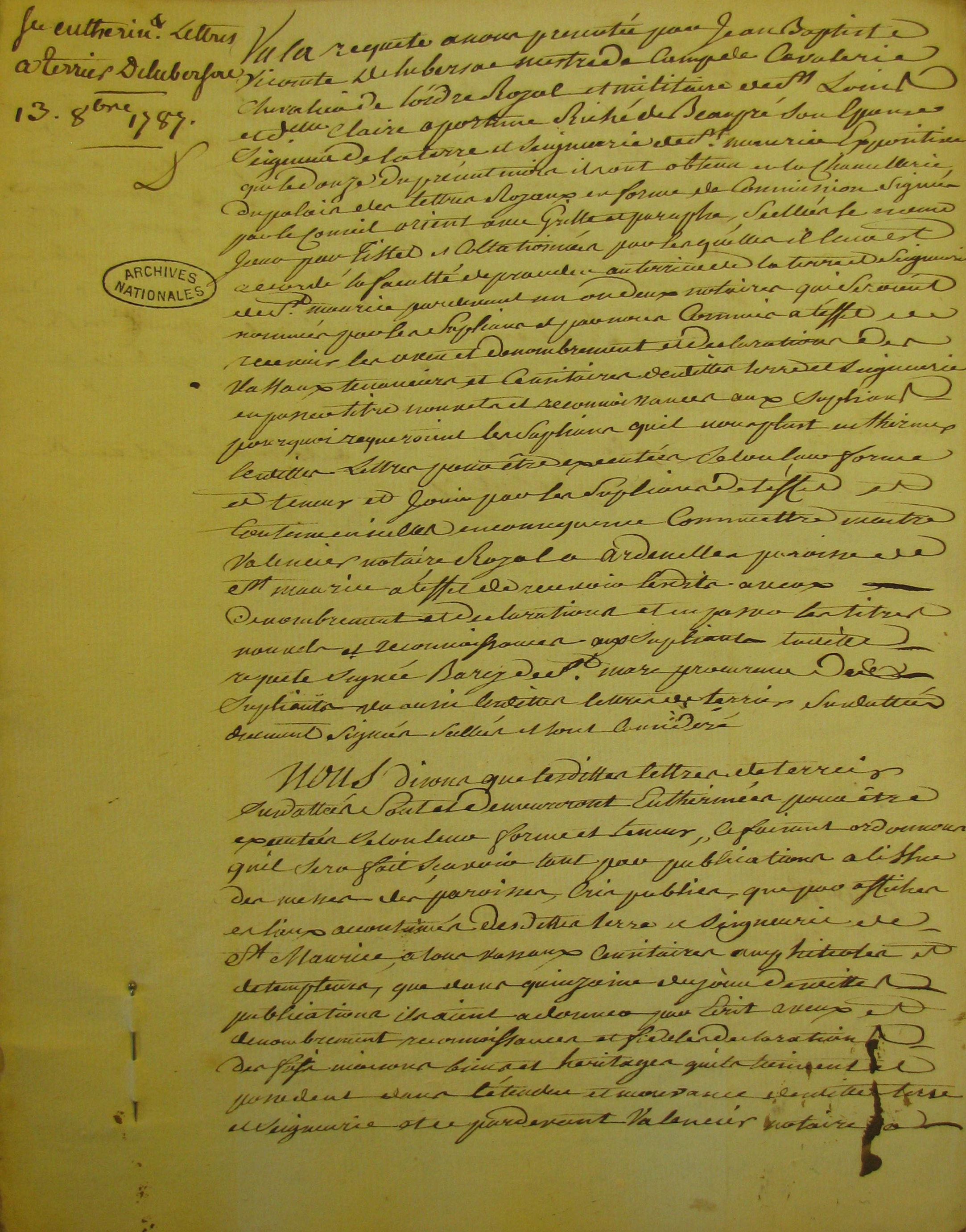 - Autorisation de dresser un terrier de la seigneurie de Saint-Maurice en 1787 — AN Y/5158/A.