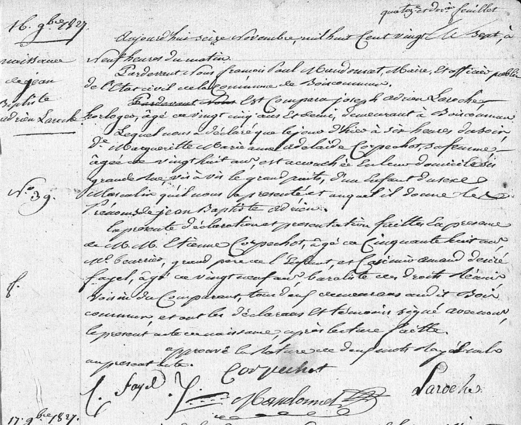 - Jean-Baptiste-Adrien Laroche, né à 15 novembre 1827 à Boiscommun (Loiret), était le fils de Marguerite-Marie-Anne-Adélaïde Corpechot et de l'horloger Joseph-Adrien Laroche (né vers 1803).