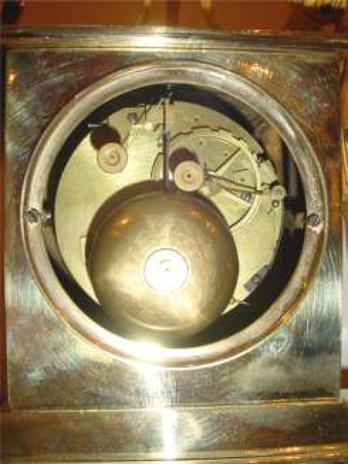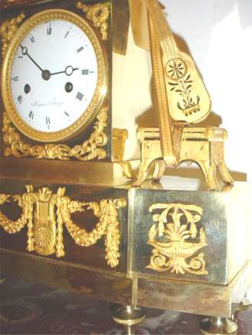 | An Excellent Gilt Bronze Clock, made in France around 1810, the Empire Period. Very fine detailed with several fine and heavy gilt bronze ornaments. Historical fashioned Troubadour playing his flute, banded lute on a bench, music stand with sheet on top. Lyre with guirlands and double horns of plenty on lower case. It all stands on 7 turnable and ciselated feet. All gilt parts in really excellent condition, all over original. Enamelled dial in good condition (tiny chip at left keyhole and tiny haircrack at XII), with Roman numerals, fine steel hands and pendulum adjust. Signature “Masure à Etampes”. Early French clockwork with pendulum hanging on silk, 8 day movement, 1/1 and 1/2 hours striking on a silvered bell. Properly running and striking. Measurements : base case 12” x 3.5”, total height 15”, dial diam. 3.5”. Overall very good condition. (…) The clocks I’m selling come from an important clocks collection in The Netherlands. | Superbe horloge de bronze doré, fabriquée en France vers 1810, sous l’Empire. Décoration très joliment détaillée avec plusieurs beaux éléments décoratifs de bronze massif doré. Troubadour en costume d’époque jouant de la flûte affronté à un luth sur un banc, et pupitre avec partition sur le sommet de l’horloge. Lyre dans une guirlande et cors doubles sur la plus grande partie de la base du boîtier. Le tout repose sur sept pieds tournant et ciselés. Cadran émaillé […] avec des chiffres romains, belles aiguilles d’acier et pendule bien réglé. Signature: «Masure à Étampes». Horloge ancienne française avec pendule pendant sur soie, mouvement de huit jours, sonnerie toutes les heures et demi-heures sur une sonnette argentée. La base du boîtier mesure 30, cm sur 9. La hauteur totale de l’horloge est de 38 cm et le diamètre de son cadran mesure 9 cm. (…) Provient d’un importante collection néerlandaise. |