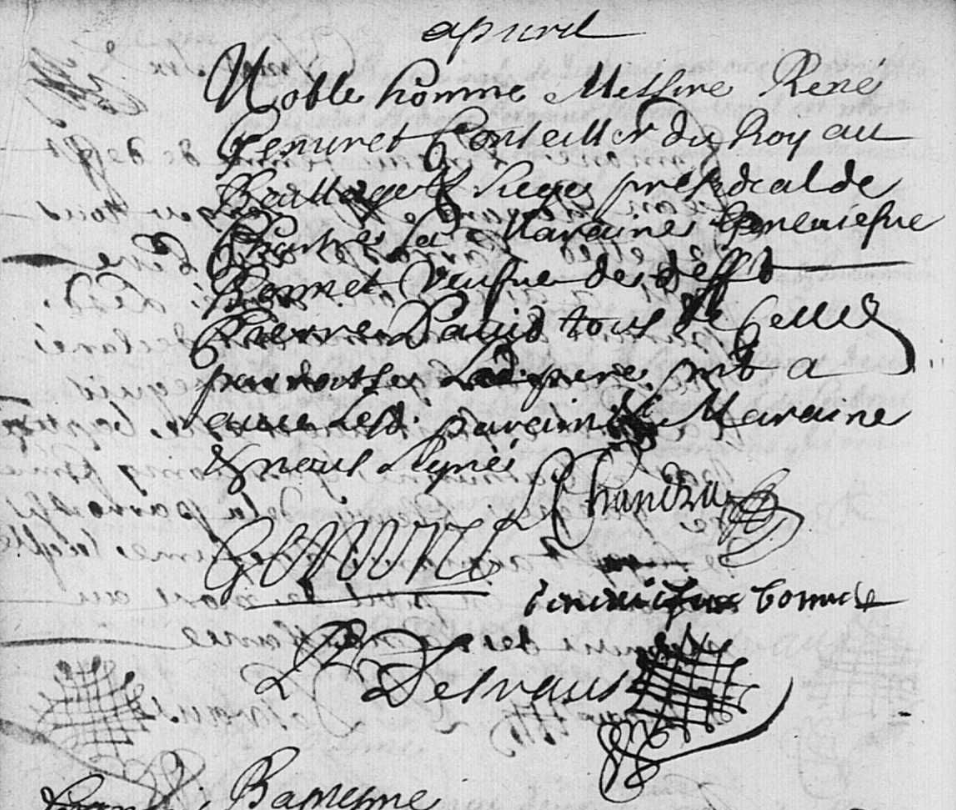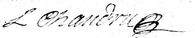 - “Baptesme — Le samedy vingt deuxième apvril mil six cents quatre vingt quatre par nous Philippe Desvaus prebstre vicaire de cette paroisse de Saint Hilaire de Chartres soubssigné fut baptizé Louis Charles Chandru fils de Louis Chandru marchand et Charlotte de la Chasseigne sa femme, son parain noble homme messire René Penuret conseiller du roy au baillage et siege présidial de Chartres, sa maraine Geneviefve Bonnet veufve de deffunt Pierre David tous de cette parroisse. le père present a avec les parain et maraine et nous signé. — [igné:] L. Chandru (paraphe) — Genure — Geneviefve Bonnet — L. Desvaux (paraphe) vic.”