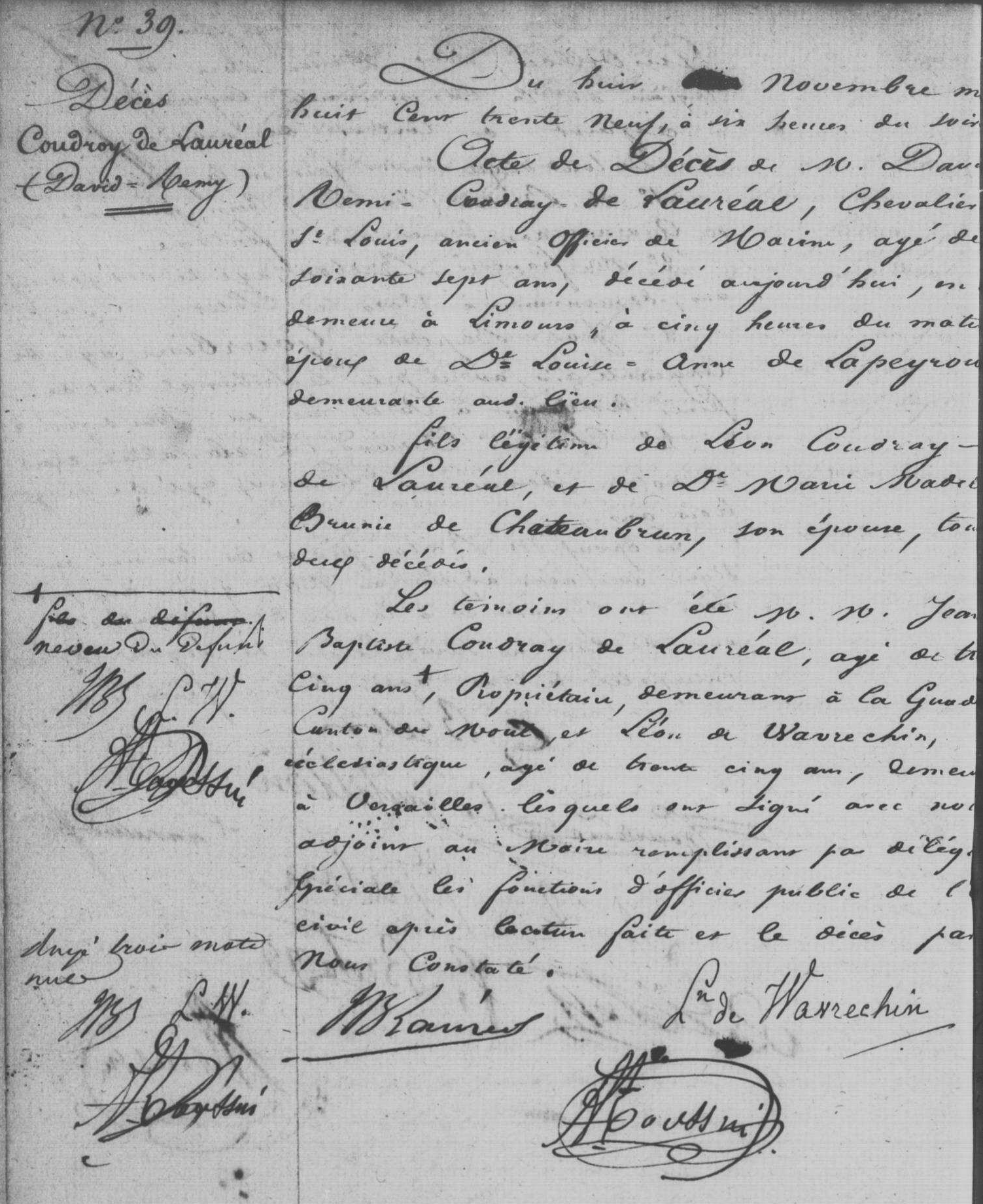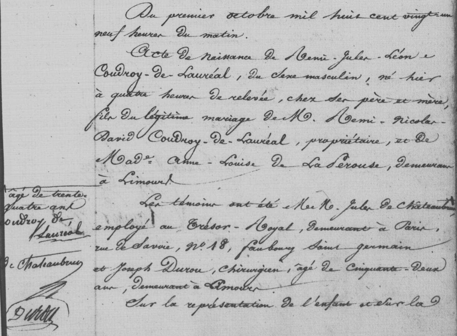 - Oncle et beau-père d'Édouard Coudroy de Lauréal, Nicolas David Henri (alias Rémy) de Coudroy de Lauréal, né au Moule le 23 octobre 1773, est décédé à Limours (Essonne) dont il fut maire. Il avait épousé vers 1800 Louise Anne (dite Nancy) de La Peyrouse. Il séjourna à Newport (Rhode Island, États-Unis d'Amérique) où naquirent au moins deux de ses filles, Marie-Madeleine comme vu supra, et Anne Françoise Adélaïde. Demoiselle Anne Françoise Adélaïde de Lauréal, 19 ans, née à Newport, État de Rhode Island, en Amérique septentrionale le 13 septembre 1806, demeurant chez ses parents, fille de M. David Coudroy de Lauréal, chevalier de Saint-Louis, maire de cette ville, et de dame Anne-Louise Lapeyrouse, épouse à Limours le 31 janvier 1826 M. Claude Adolphe Montanier de Belmont, propriétaire, 26 ans, né à Lissy, Seine-et-Marne, le 14 août 1799 (27 thermidor an VII), déclaré le lendemain (État civil de Lissy), demeurant à Paris, rue Saint-Joseph, fils de M. Antoine Montanier de Belmont, ancien capitaine d'infanterie, demeurant à Paris, rue des Grès, n°10, et de feue dame Élisabeth Madeleine Pageaut, en présence d'Edme Jean Blaque, 72 ans, avocat à la Cour royale, demeurant à Paris, rue de Saintonge, ami de l'époux, de Jean Bernard Pageaut de Lissy, 68 ans, contrôleur général honoraire des finances de monseigneur le comte d'Artois, aujourd'hui Charles X, ancien président de l'ordre des avocats aux |1934| Conseils du Roi et en la Cour de cassation, demeurant à Paris, 13, rue de Saintonge, oncle de l'époux, de Jules Louis Charles Bruny de Chateaubrun, 38 ans, sous-chef au ministère des finances, demeurant à Paris, 20, rue Dauphine, cousin de l'épouse, et d'Évremond Coudroy de Lauréal, 42 ans, propriétaire, demeurant à Paris, rue des Vieux-Augustins, n°21. Nicolas David Coudroy et Anne Louise de La Peyrouse eurent encore des enfants à Limours : Rémi Jules Léon Coudroy de Lauréal né à Limours le 30 septembre 1821, déclaré le lendemain, décédé le 19 octobre suivant, fils de Rémi Nicolas David Coudroy de Lauréal, propriétaire, et de madame Anne Louise de La Peyrouse, et Louise Marie Madeleine Léontine, née le 9 août 1831, fille de M. Rémy David Coudroy de Lauréal, propriétaire, chevalier de Saint-Louis, 58 ans, et de dame Anne Louise de La Peyrouse, 44 ans. À Limours le 8 novembre 1839 est déclaré le décès de David Henri Coudroy de Lauréal, chevalier de Saint-Louis, ancien officier de marine, 67 ans, époux de dame Louise Anne de La Peyrouse, fils de Léon Coudroy de Lauréal et de dame Marie-Madeleine Brunie (sic) de Chateaubrun, les témoins étant son fils Jean-Baptiste Coudroy de Lauréal, 35 ans, propriétaire à la Guadeloupe, canton du Moule, et Léon de Wavrechin, son neveu, ecclésiastique, 35 ans.