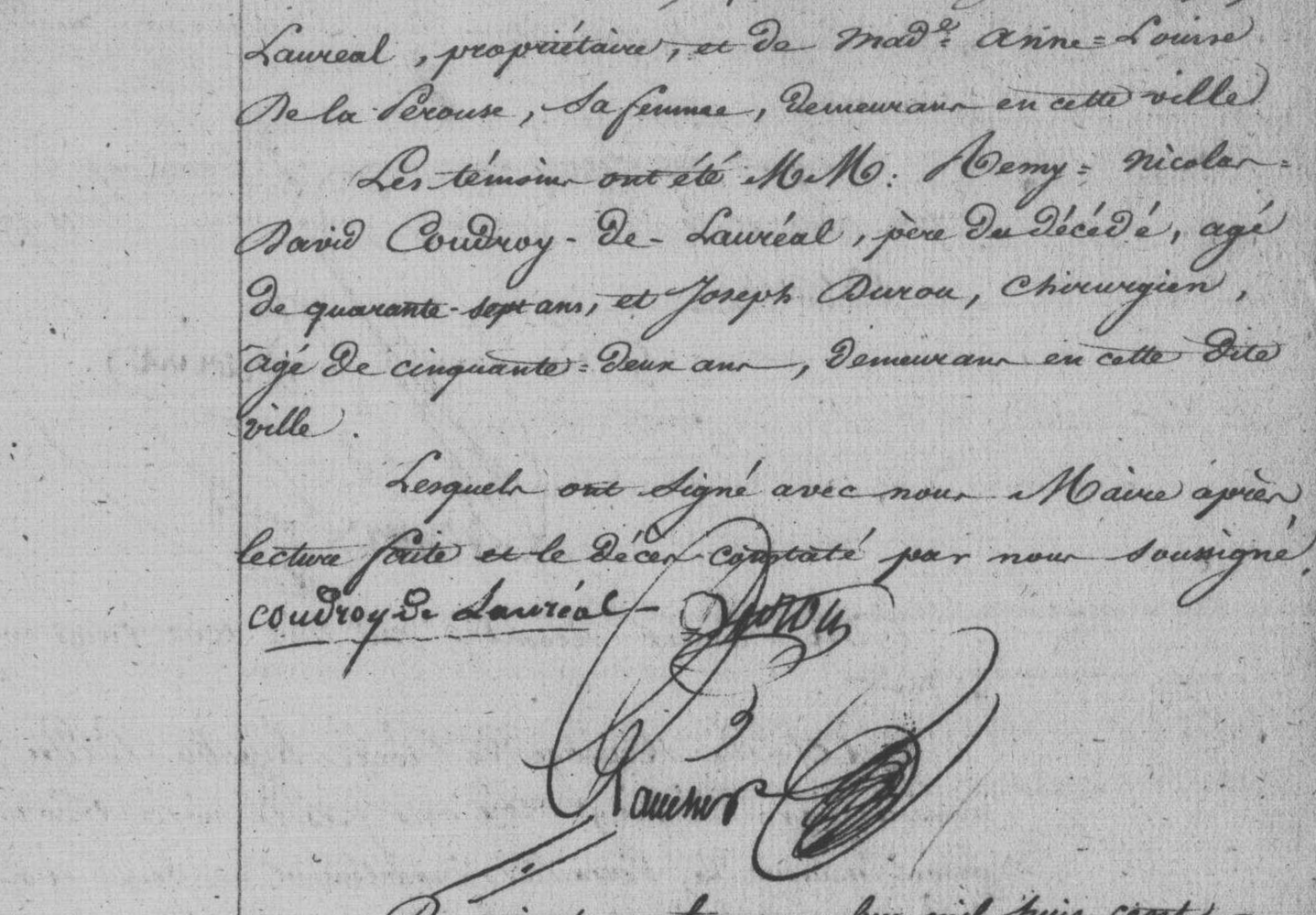 - Nicolas David Remy de Coudroy de Lauréal, the fifth child, was born at Moule, Guadeloupe, on the 23rd of December 1773. |81|