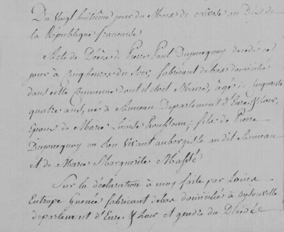 - Pierre-Paul Dujoncquoy, né à Auneau (Eure-et-Loir) le 7 octobre 1747, était le fils de Marie-Marguerite Massé (1716-1764) et de l'aubergiste Pierre II Dujoncquoy (1702-1758).