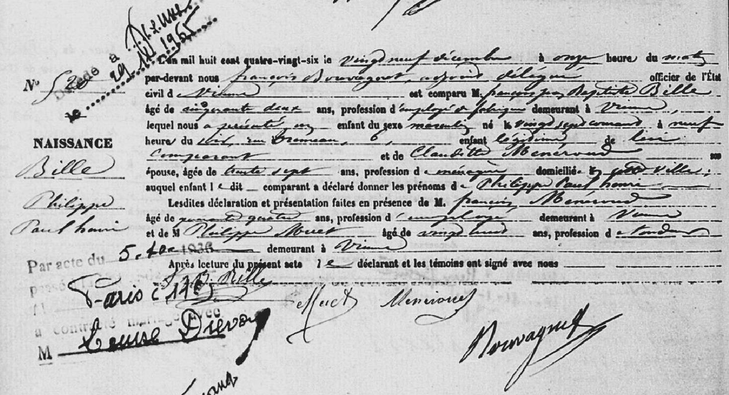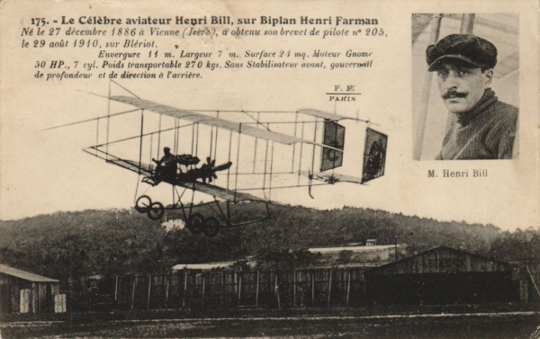 - Si vous vous amusez à consulter et à feuilleter les registres de l'état-civil, vous vous apercevrez que Philippe-Paul-Henri Bille naquit le 27 décembre 1886 à Vienne (Isère). Si vous feuilletez la presse de l'époque héroïque de l'aviation, ou l'annuaire des brevets des Vieilles Tiges, vous y verrez figurer le nom d'Henri Bill, toujours sans 'e' à la fin (et toujours sous le même prénom d'Henri); si vous persistez dans vos recherches localisées entre 1910 et 1952, vous trouverez toujours cette même erreur dans nombre de publications, de récits ou de souvenirs.