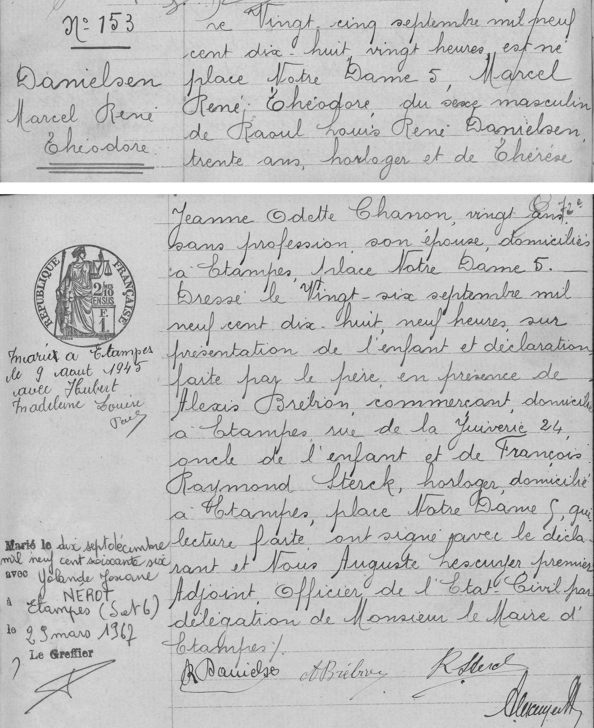 - Il se maria à Orléans le 5 mars 1917 avec avec Thérèse-Jeanne-Odette Chanon.