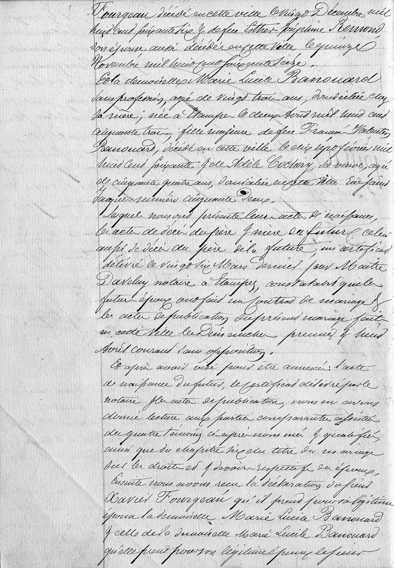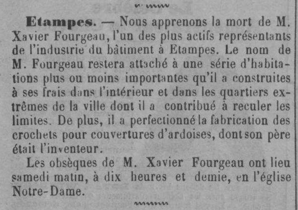 - “Nous apprenons la mort de M. Xavier Fourgeau, l'un des plus actifs représentants de l'industrie du bâtiment à Étampes. Le nom de M. Fourgeau restera attaché à une série d'habitations plus ou moins importantes qu'il a construites à ses frais dans l'intérieur et dans les quartiers extrêmes de la ville dont il a contribué à reculer les limites. De plus, il a perfectionné la fabrication des crochets pour couverture d'ardoise, dont son père était l'inventeur.