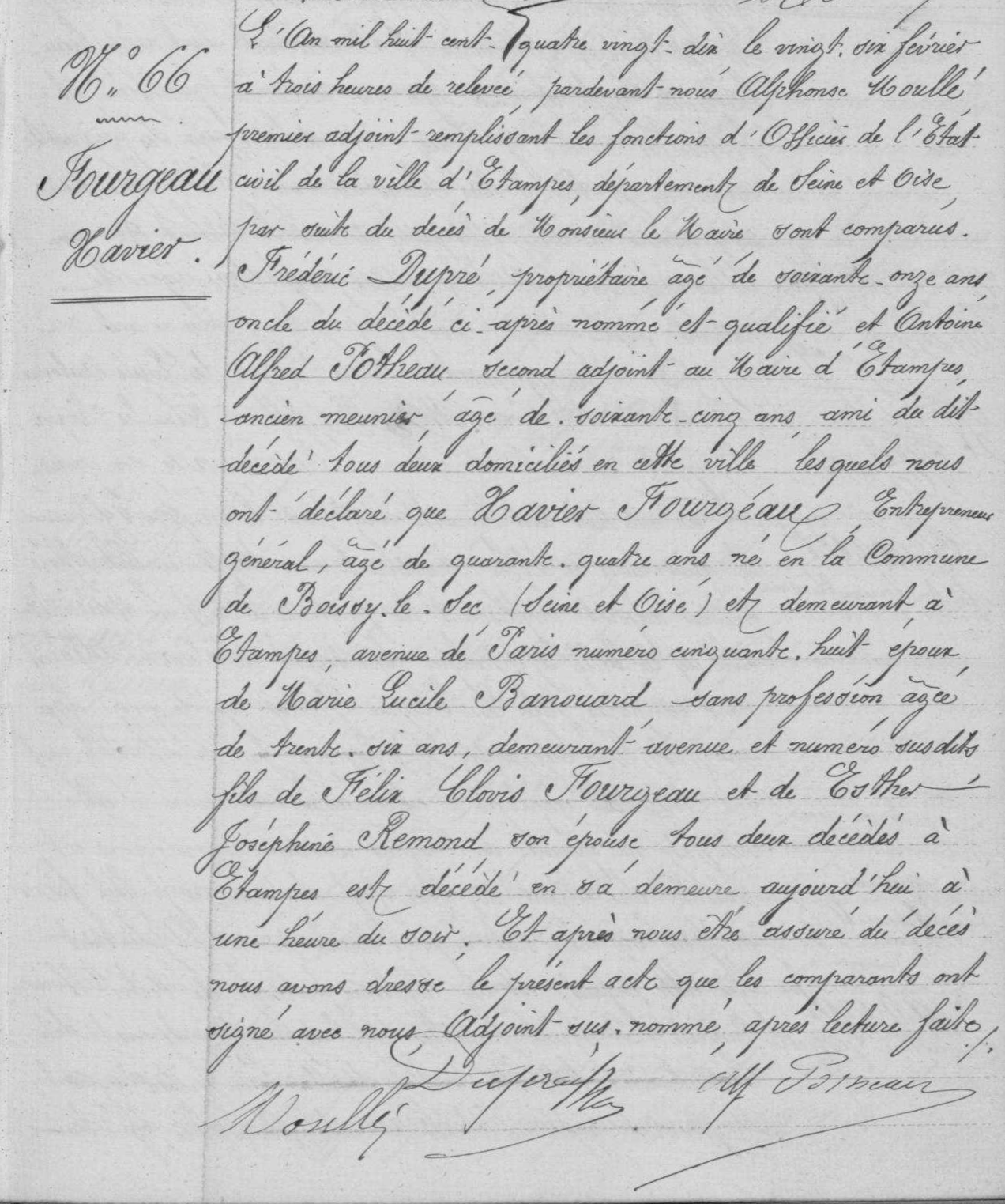 - Xavier Fourgeau, né le 2 décembre 1845 à Boissy-le-Sec, était le fils d'Esther-Joséphine Rémond (1822-1876) et de Félis-Clovis Fourgeau (1816-1866), entrepreneur du bâtiment (maître maçon en 1845, entrepreneur de maçonnerie en 1862).