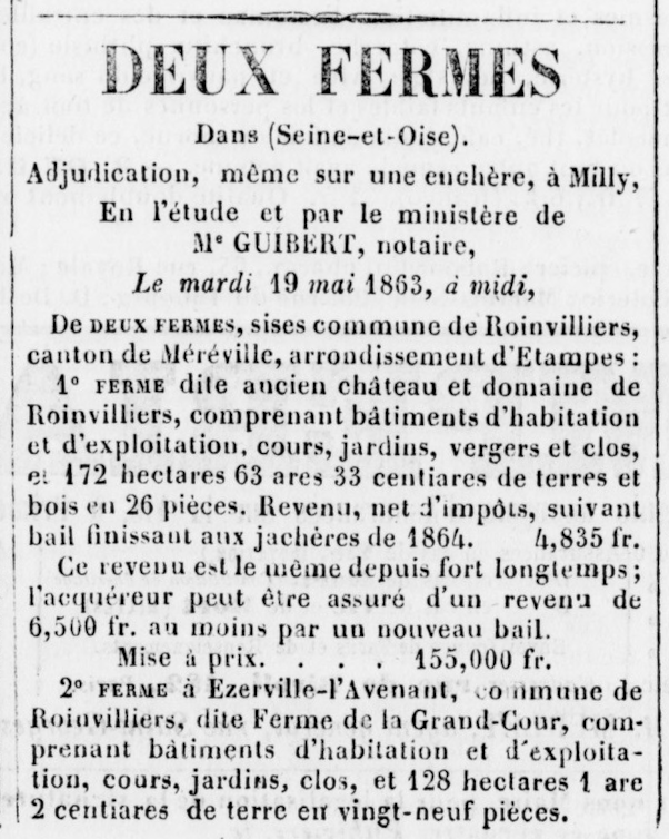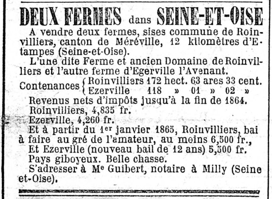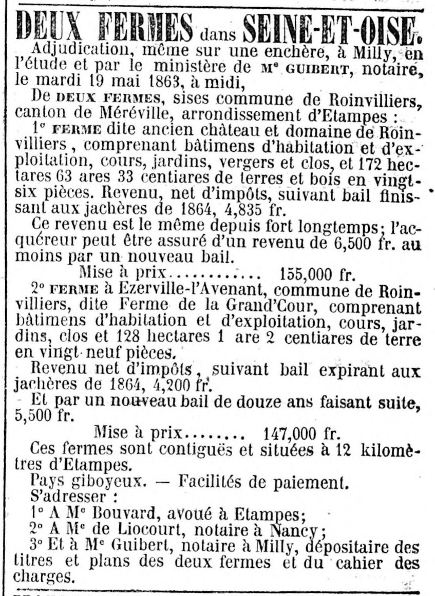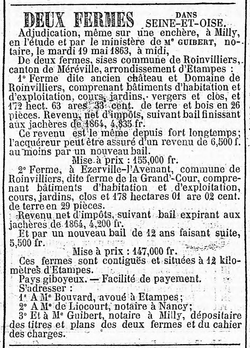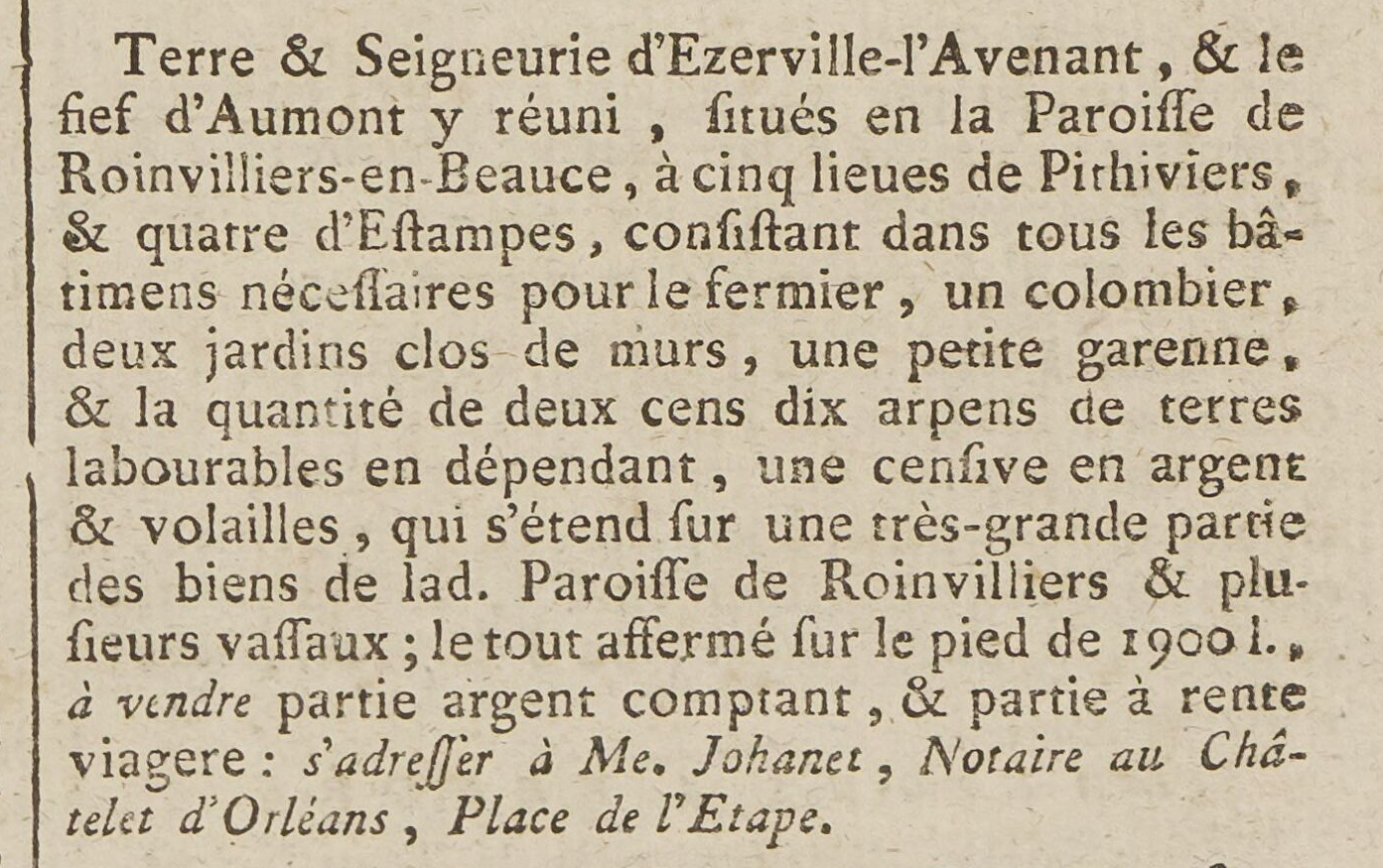 - Roinvilliers-en-Beauce, à cinq lieues de Pithiviers, et quatre d'Estampes, consistant dans tous les bâtimens nécessaires pour le fermier, un colombier, deux jardins clos de murs, une petite garenne, et la quantité de deux cens dix arpens de terres labourables en dépendant, une censive en argent et volailles, qui s'étend sur une très-grande partie des biens de lad. Paroisse de Roinvilliers et plusieurs vassaux; le tout affermé fur le pied de 1900 livres, à vendre partie argent comptant, et partie à rente viagère: s'adresser à Me. Johanet, Notaire au Châtelet d'Orléans, Place de l'Étape.