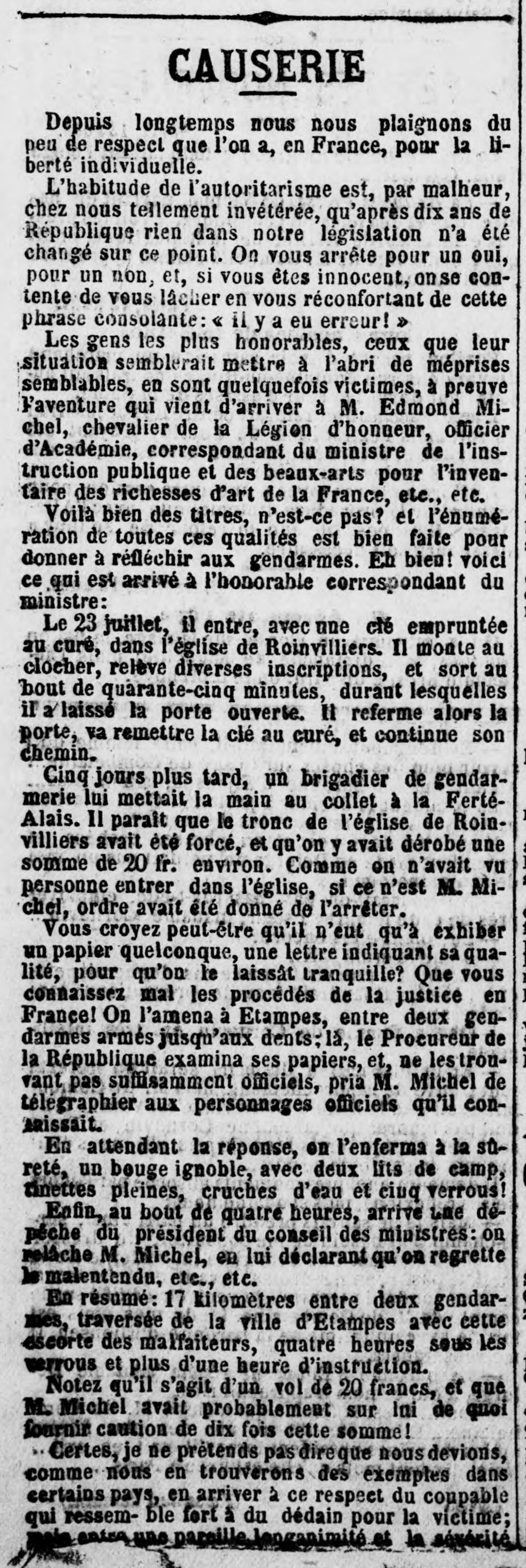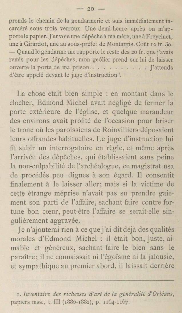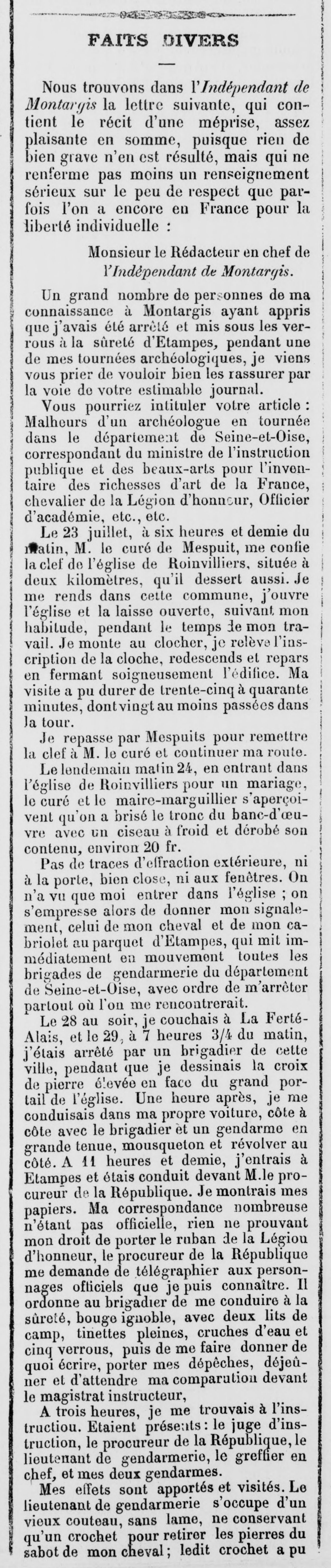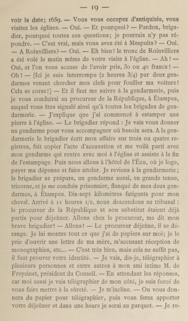 - Il était 7 heures 10 du matin, à la Ferté-Alais. J'allai trouver le curé à l'église, dans la sacristie, lui expliquai le but de mes recherches et lui demandai la permission de relever les pierres tombales de son église et de monter au clocher. Il m'accorde toute autorisation et me donne un enfant de chœur pour m'ouvrir le clocher. Je monte et prends l'inscription, je redescends, remets la clef à l'enfant et commence à estamper une pierre tombale devant la grande porte à l'intérieur. À peine avais-je commencé que le curé monte à l'autel; je sors pour ne pas troubler les fidèles et vois une croix en face du grand portail. Je m'assieds sur une marche et la regarde: c'est un chapiteau de la fin du XIIe siècle à larges feuilles retroussées, avec son astragale et une partie du fût. Je vois la date d'érection — 1659. — À peine commencé-je à écrire les détails de cette croix que passe un brigadier de gendarmerie. Il me regarde, je le regarde et reprends mon travail. Deux minutes après il repasse et m'aborde: “Elle est vieille, cette croix? — Oui, je viens de |19| voir la date; 1659. — Vous vous occupez d'antiquités, vous visitez les églises. — Oui. — Et pourquoi? — Pardon, brigadier, pourquoi toutes ces questions; je pourrais n'y pas répondre. — C'est vrai, mais vous avez été à Mespuits? — Oui. — À Roinvilliers? — Oui. — Eh bien! le tronc de Roinvilliers a été volé le matin même de votre visite à l'église. — Ah! — Oui, et l'on vous accuse de l'avoir pris, 30 ou 40 francs! — Oh! — [Ici je suis interrompu (2 heures 3/4) par deux gendarmes venant chercher mes clefs pour fouiller ma voiture! Cela se corse!] — Et il faut me suivre à la gendarmerie, puis je vous conduirai au procureur de la République, à Étampes, auquel vous êtes signalé ainsi qu'à toutes les brigades de gendarmerie. — J'explique que j'ai commencé à estamper une pierre à l'église. — Le brigadier répond: Je vais vous donner un gendarme pour vous accompagner où besoin sera. À la gendarmerie le brigadier écrit mon affaire sur trois ou quatre registres, fait copier l'acte d'accusation et me voilà parti avec mon gendarme qui rentre avec moi à l'église et assiste à la fin de l'estampage. Puis nous allons à l'hôtel de l'Écu, où je loge, payer ma dépense et faire atteler. Je reviens à la gendarmerie; le brigadier se prépare, un gendarme aussi, en grande tenue, tricorne, et je me conduis prisonnier, flanqué de mes deux gendarmes, à Étampes. Dix-sept kilomètres fatigants pour mon cheval. Arrivé à 11 heures 1/2, nous descendons au tribunal: le procureur de la République et son substitut étaient déjà partis pour déjeûner. Allons chez le procureur, me dit mon brave brigadier! — Allons! — Le procureur déjeûne, il se dérange. Je lui montre tout ce que j'ai de papiers sur moi; je le prie d'ouvrir une lettre de ma mère, m'accusant réception de monographies, etc… — C'est très bien, mais cela ne suffit pas, il faut prouver votre identité. — Je vais, dis-je, télégraphier à plusieurs personnes et entre autres à mon ami intime M. de Freycinet, président du Conseil. — En attendant les réponses, car moi aussi je vais télégraphier de mon côté, je suis forcé de vous faire mettre à la sûreté. — Je m'incline. — On vous donnera du papier pour télégraphier, puis vous ferez apporter votre déjeûner et dans une heure je serai au parquet. — Je reprends |20| le chemin de la gendarmerie et suis immédiatement incarcéré sous trois verroux. Une demi-heure après on m'apporte le papier. J'envoie une dépêche à ma mère, une à Freycinet, une à Girardot, une au sous-préfet de Montargis. Coût 12 fr. 30. — Quand le gendarme me rapporte le reste des 20 fr. que j'avais remis pour les dépêches, mon geôlier prend sur lui de laisser ouverte la porte de ma prison J'attends d'être appelé devant le juge d'instruction (1)