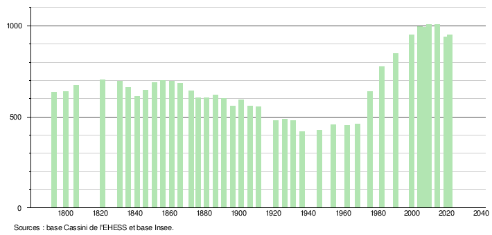 Sur la base de données empruntées, pour les années 1793-1999, au site du Laboratoire de Démographie et d'Histoire Sociale de l'EHESS, École des hautes études en sciences sociales; et, pour les années 2006 à 2021, au site de l'INSEE, Institut national de la statistique et des études économiques.