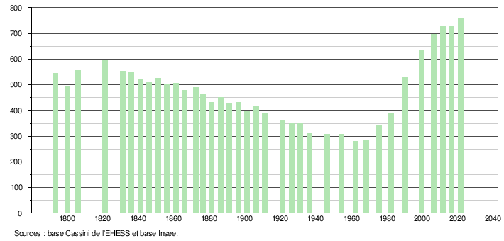 Sur la base de données empruntées, pour les années 1793-1999, au site du Laboratoire de Démographie et d'Histoire Sociale de l'EHESS, École des hautes études en sciences sociales; et, pour les années 2006 à 2021, au site de l'INSEE, Institut national de la statistique et des études économiques.